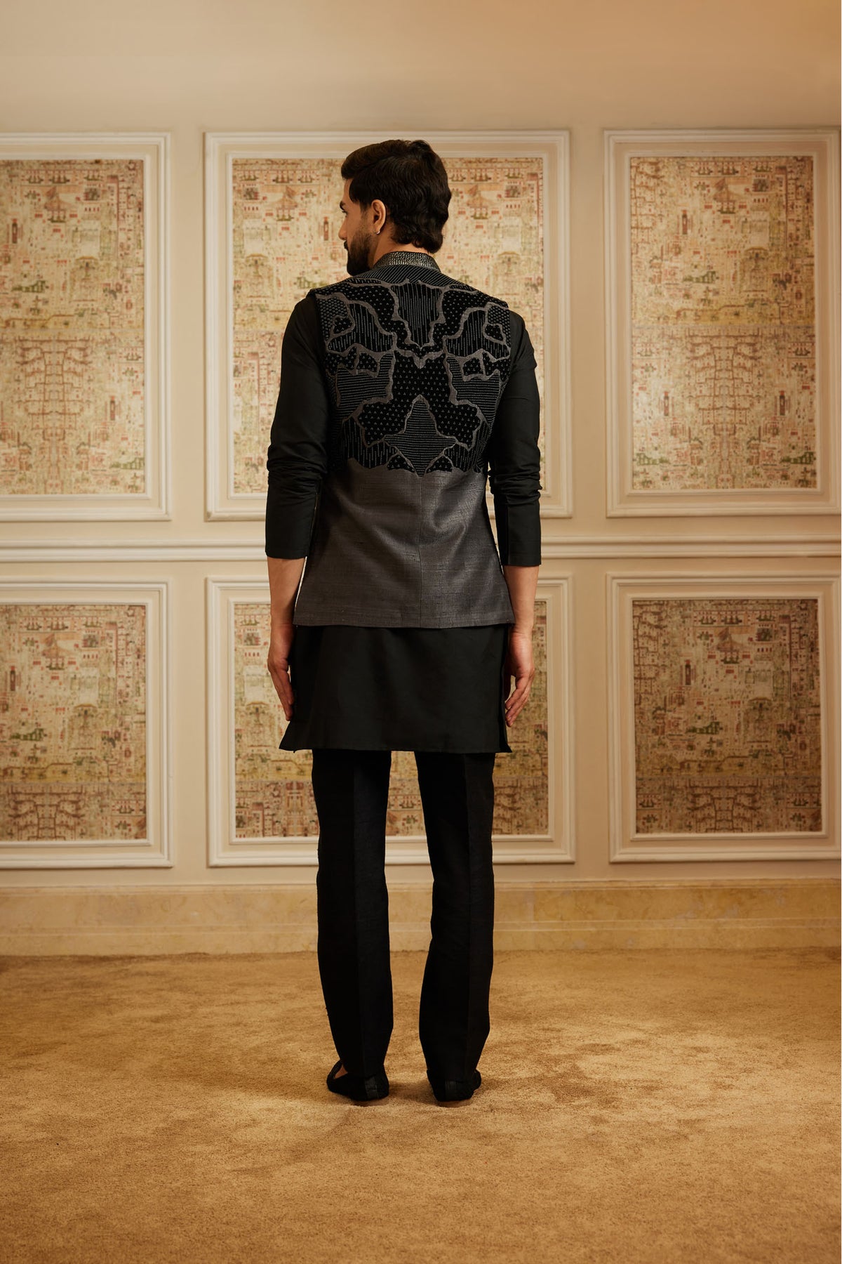 Featuring a black bundi set, with a cotton silk kurta and pant set. Paired with hand-embroidered bundi on raw silk with suede leather work.