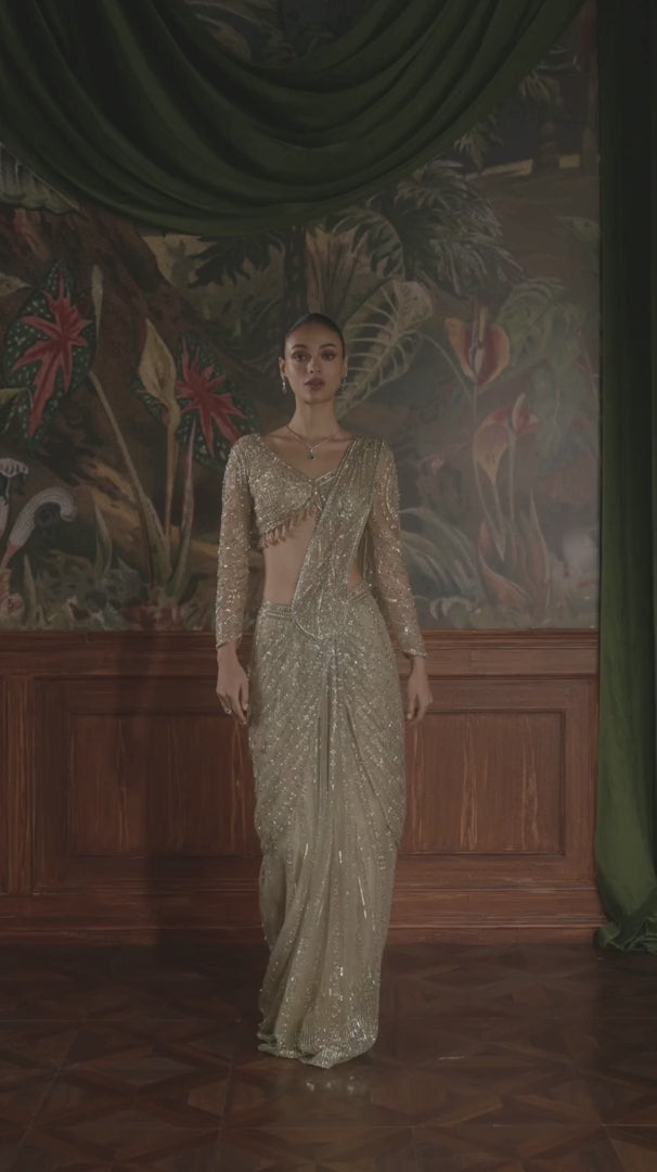 An tribute to an everlasting gold draped saree. A seamless cascading sequins, glimmering crystals, and intricate bugle beadwork unveils a spellbinding symphony of opulence and grace in this hand embroidered gold masterpiece. The draped saree based on net is an effortless amalgamation of timeless couture. Paired with a full sleeves blouse and playful tassels at the hem.