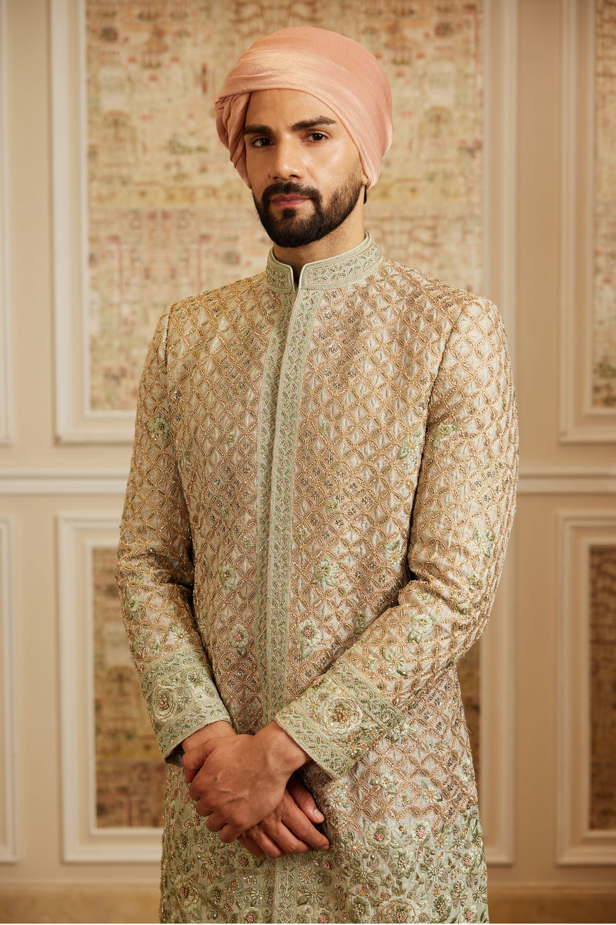 This sherwani features dual shade green and pink thread embroidery on a raw silk base. It comes with a matching textured silk kurta and pants.