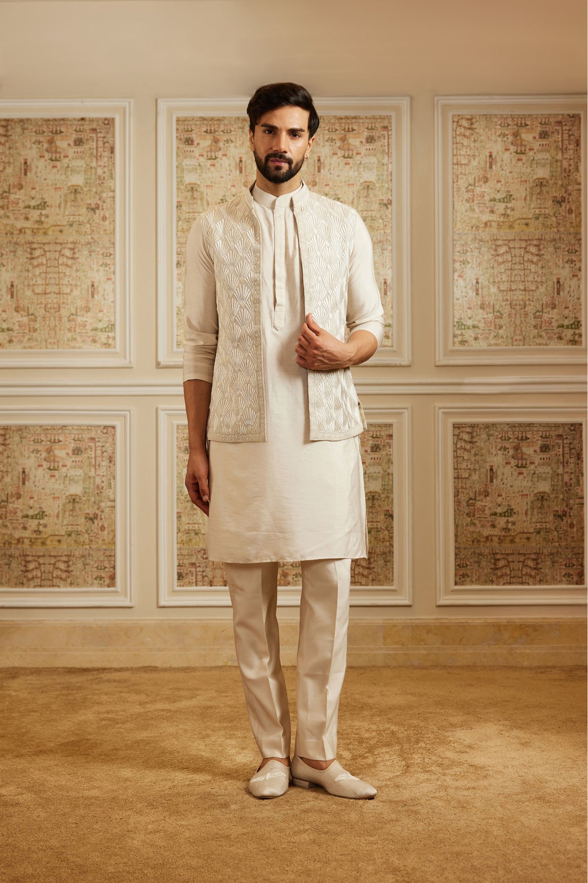 Armin bundi set in ivory is based on pure cotton silk. The bundi jacket is on raw silk with vintage resham embroidery.