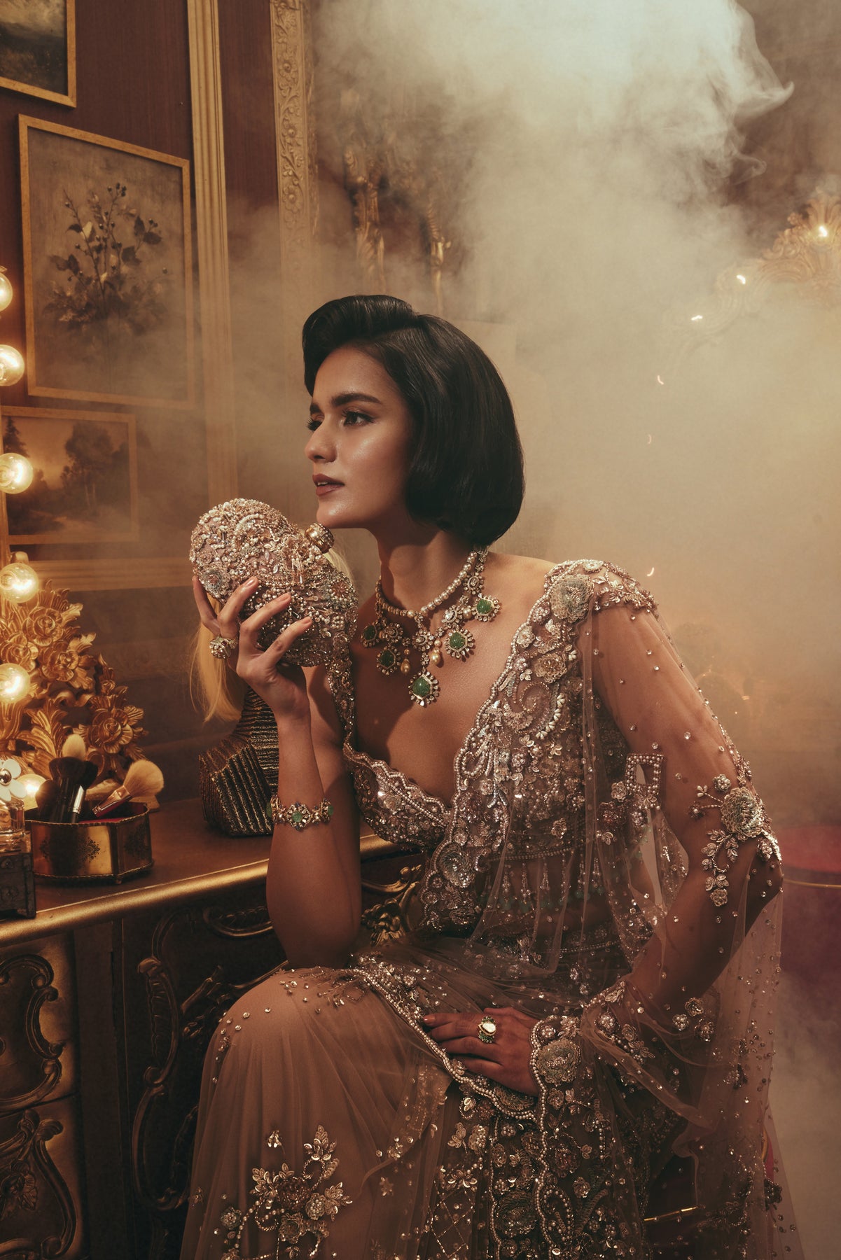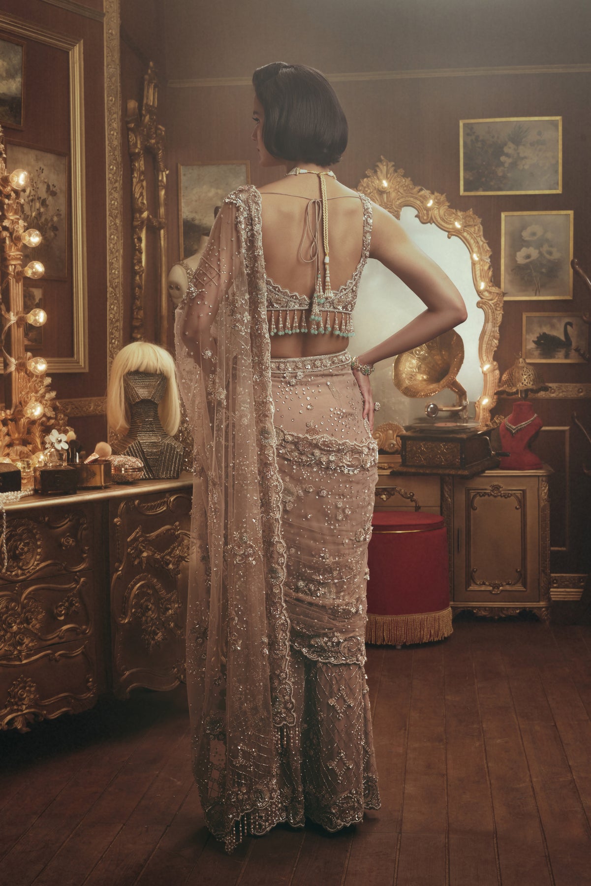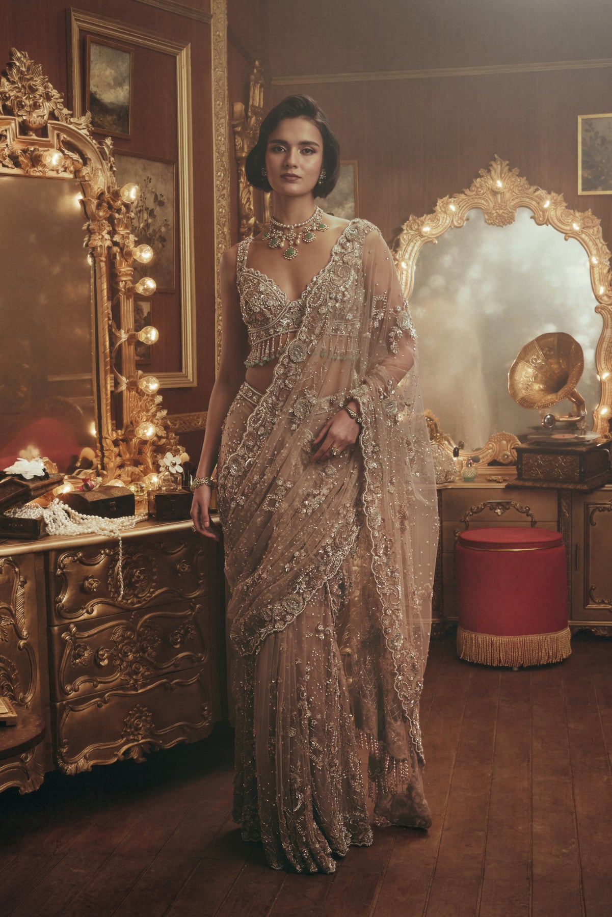 This saree is rendered in soft nude hues and enriched with intricate hand embroidery. The finely embellished blouse complements a sheer, fluid drape adorned with delicate beadwork, ornate motifs, and detailed borders. Subtle shimmer adds depth while maintaining a refined, graceful silhouette.