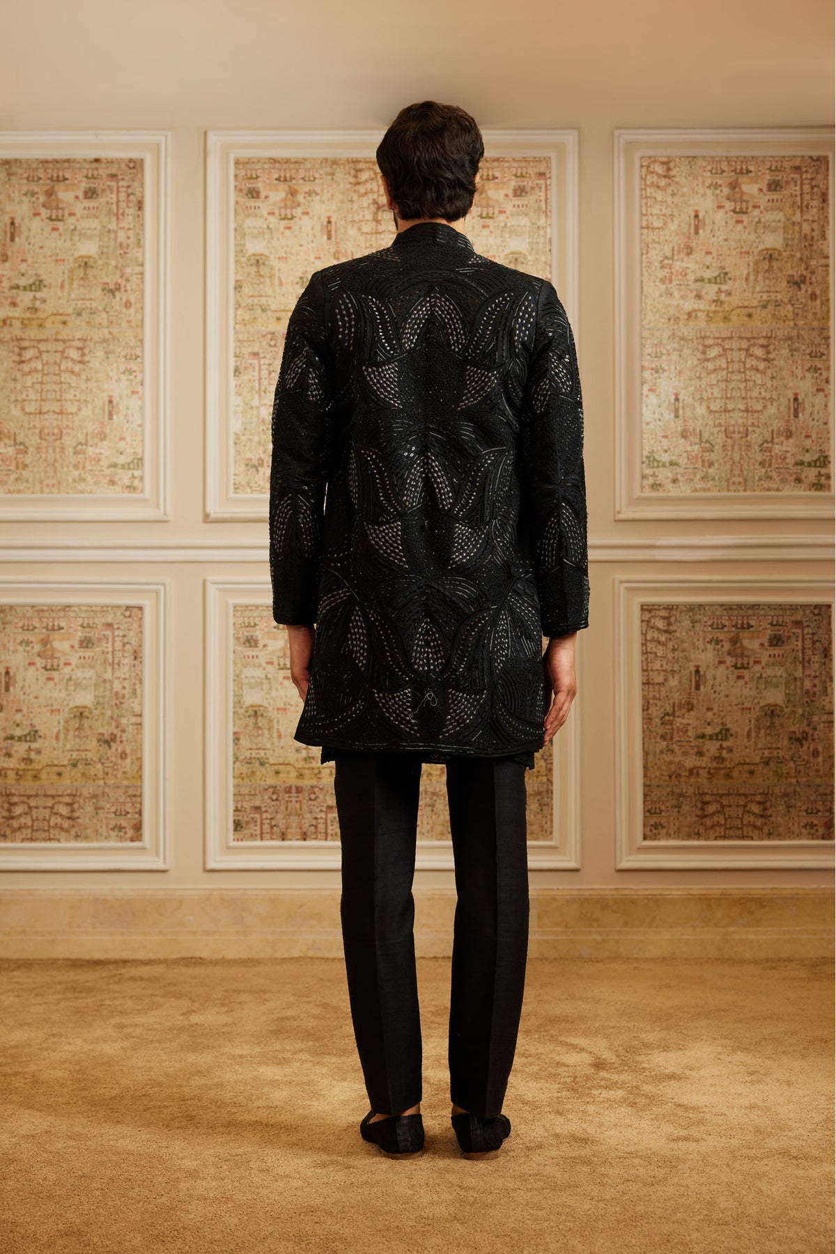 Showcasing a black bandhgala set, with tone and tone embroidery. Paired with black pants and a kurta set made in pure cotton silk.