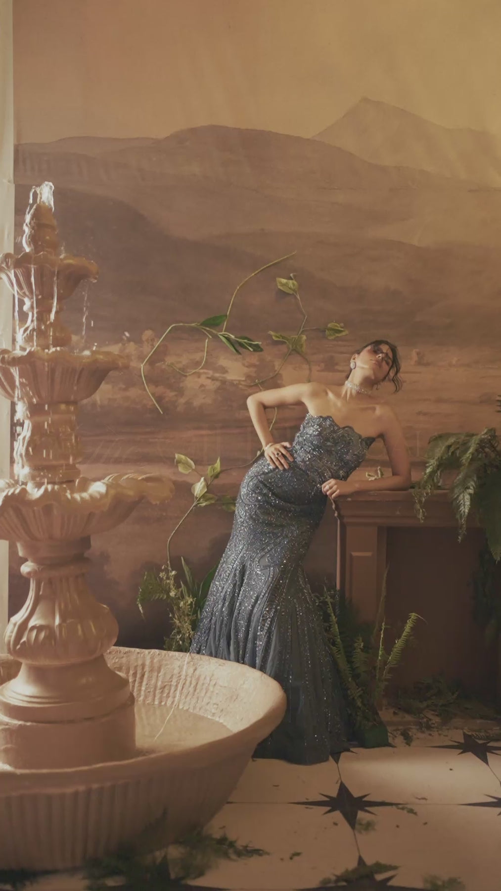 Radiating elegance with a touch of mystique, this midnight mermaid gown is a vision of sculpted glamour. The strapless silhouette hugs the body with effortless grace, flaring gently into a dramatic hem. The Celestial mermaid gown is an ode to Ornate Elegance and Opulent Celebration.The Intricate sequin work in swirling patterns catches the light with every movement, creating a mesmerizing interplay of texture and shine.