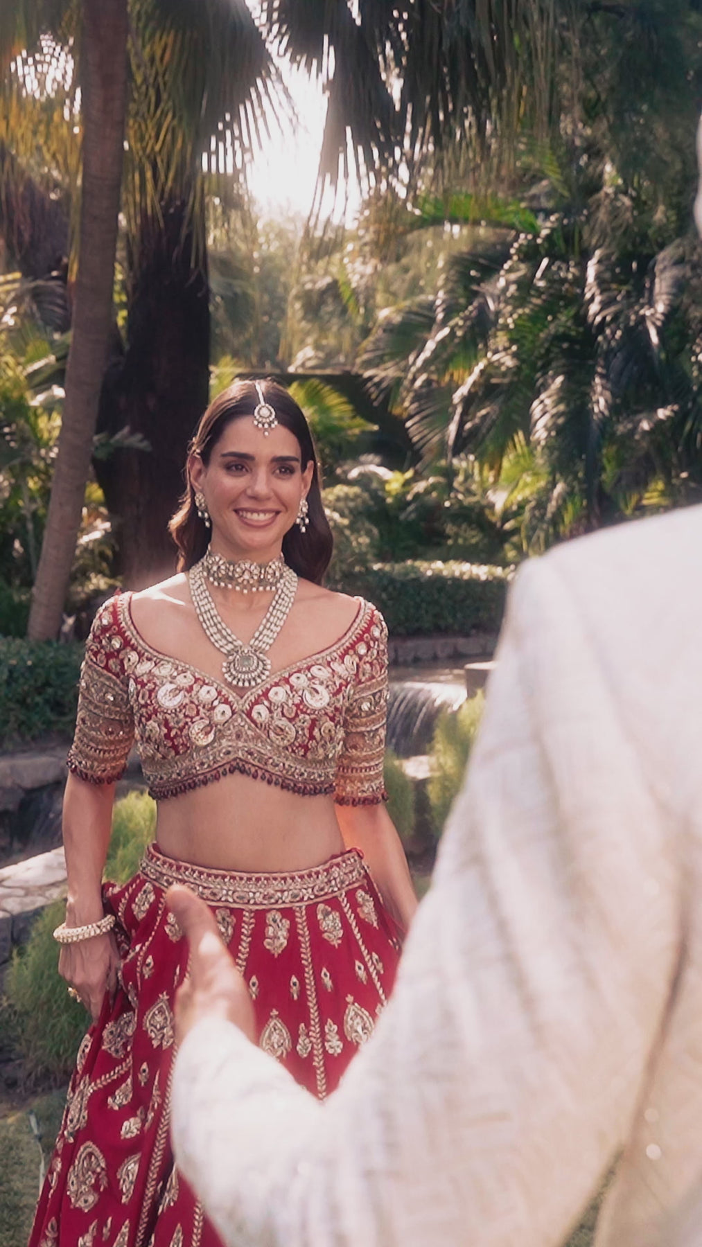 Crafted in luxurious raw silk, this statement bridal lehenga in deep red embodies the grandeur of tradition with a modern sensibility. Adorned with intricate jadau jewellery sourced from Gujarat. The outfit showcases embroidery in gold thread and shimmering embellishments; radiating opulence while celebrating the sanctity of the wedding ceremony. The richly embroidered blouse pairs gracefully with a flowing lehenga skirt, each motif symbolizing heritage and artistry. A sheer dupatta, delicately bordered with handwork, completes the look, making it a timeless choice for the bride stepping into her “ever after.”