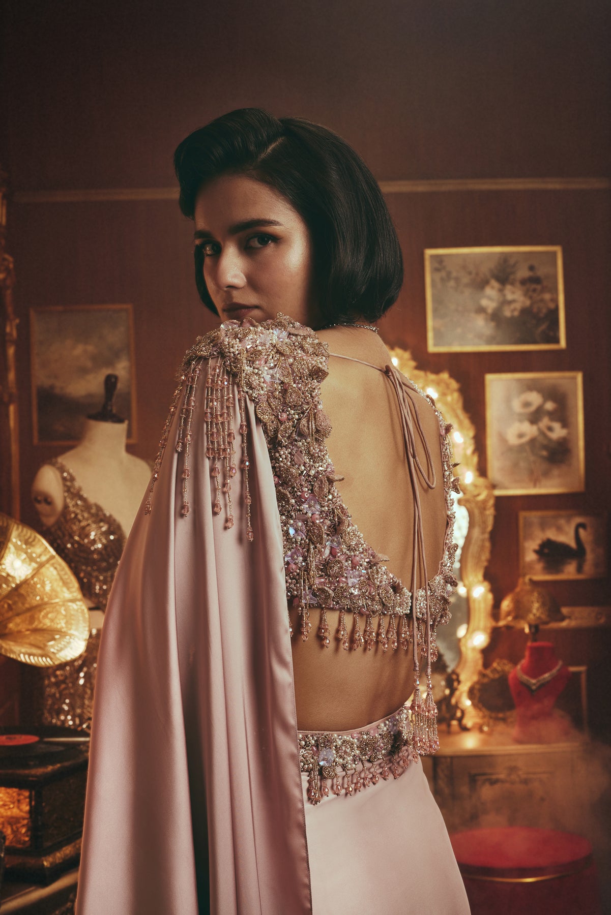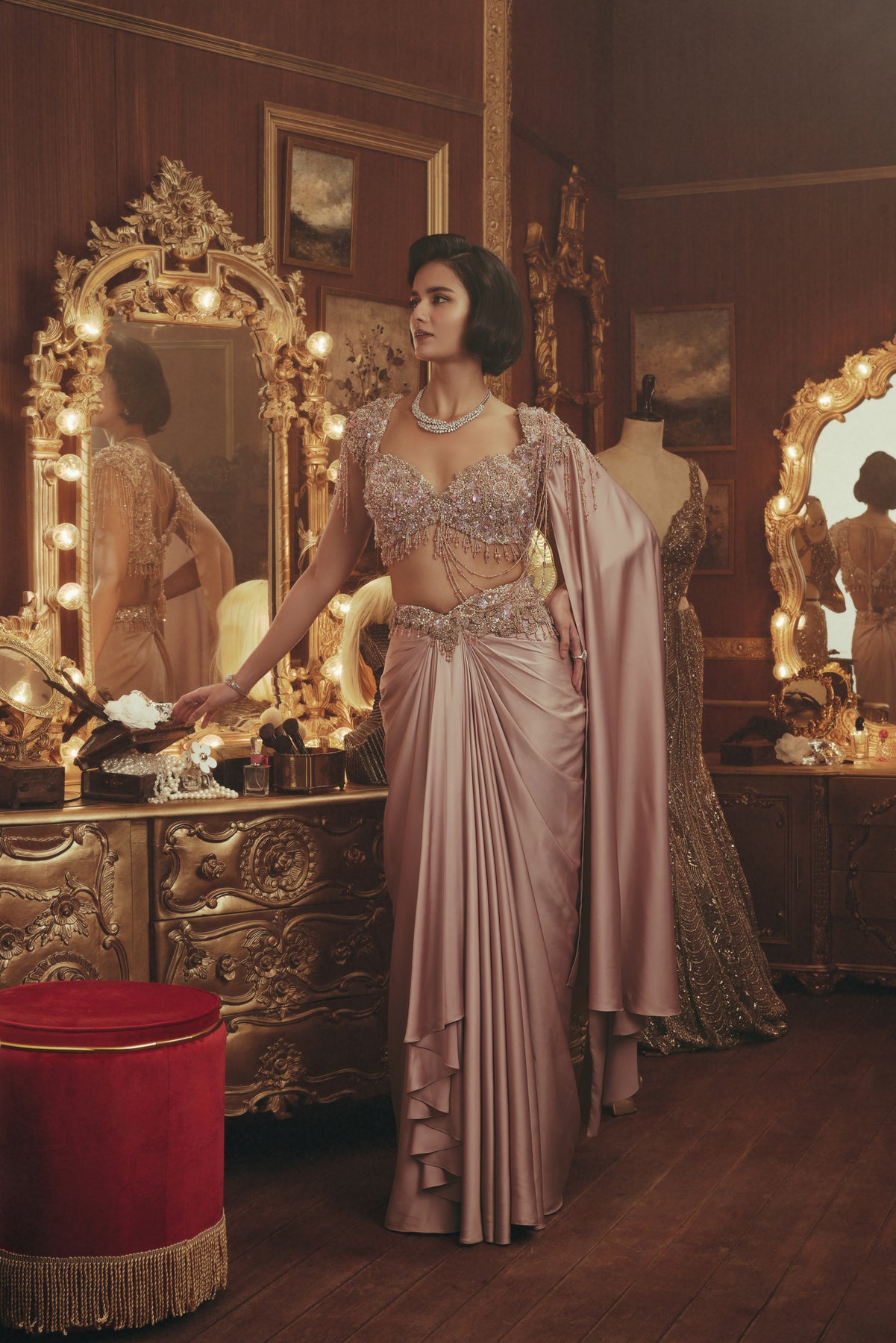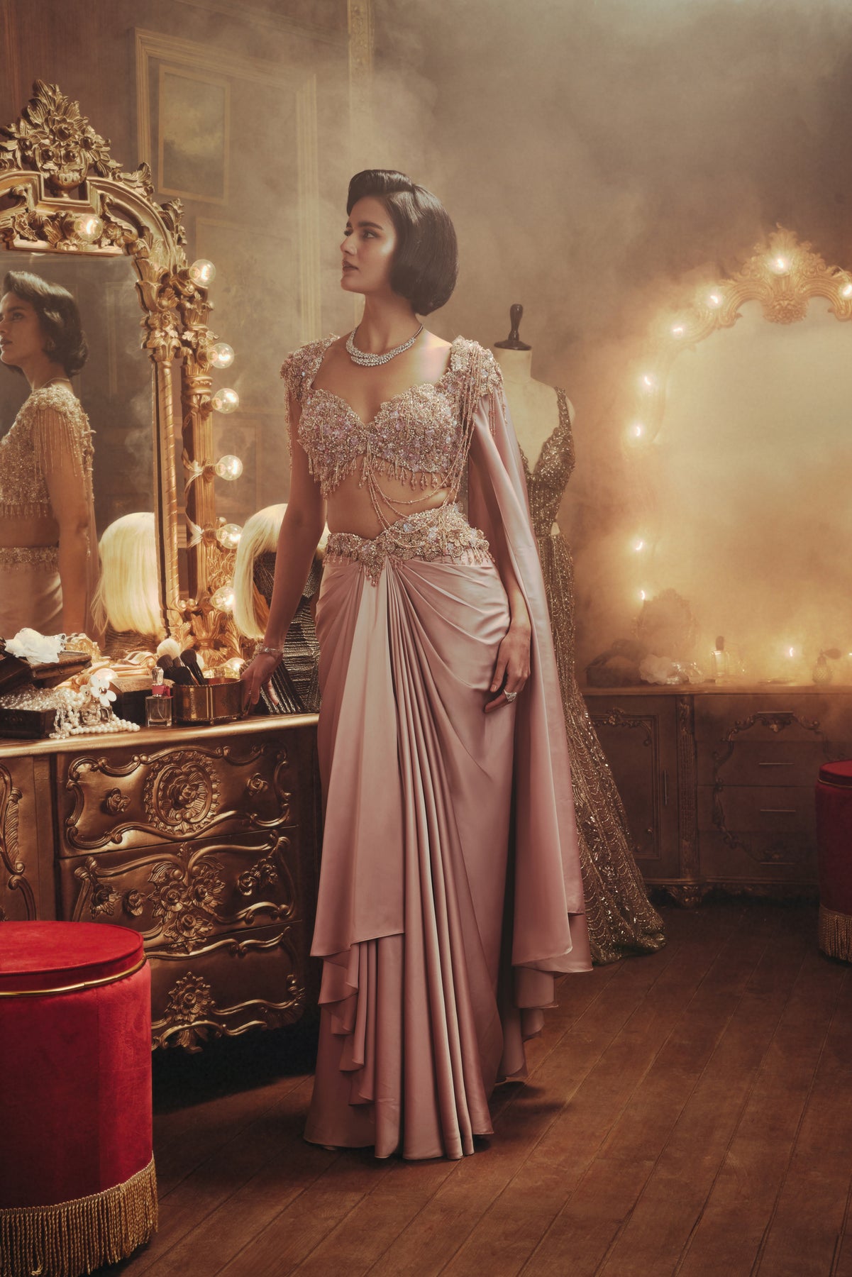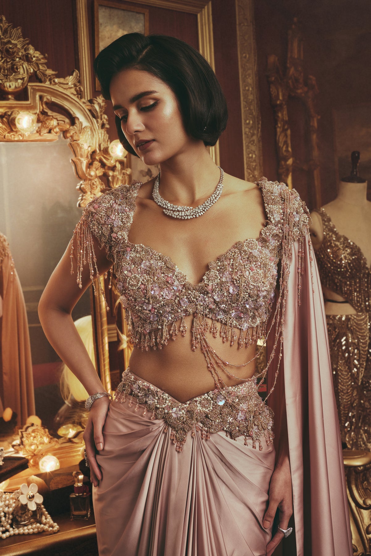 A statement of timeless glamour. This luxury draped ensemble features a meticulously embellished blouse paired with a fluid, softly structured skirt that flatters the silhouette. Intricate beadwork, crystal accents, and delicate chain detailing contour the form with refined precision. The sculpted silhouette is balanced by a graceful cape, adding movement and quiet drama.