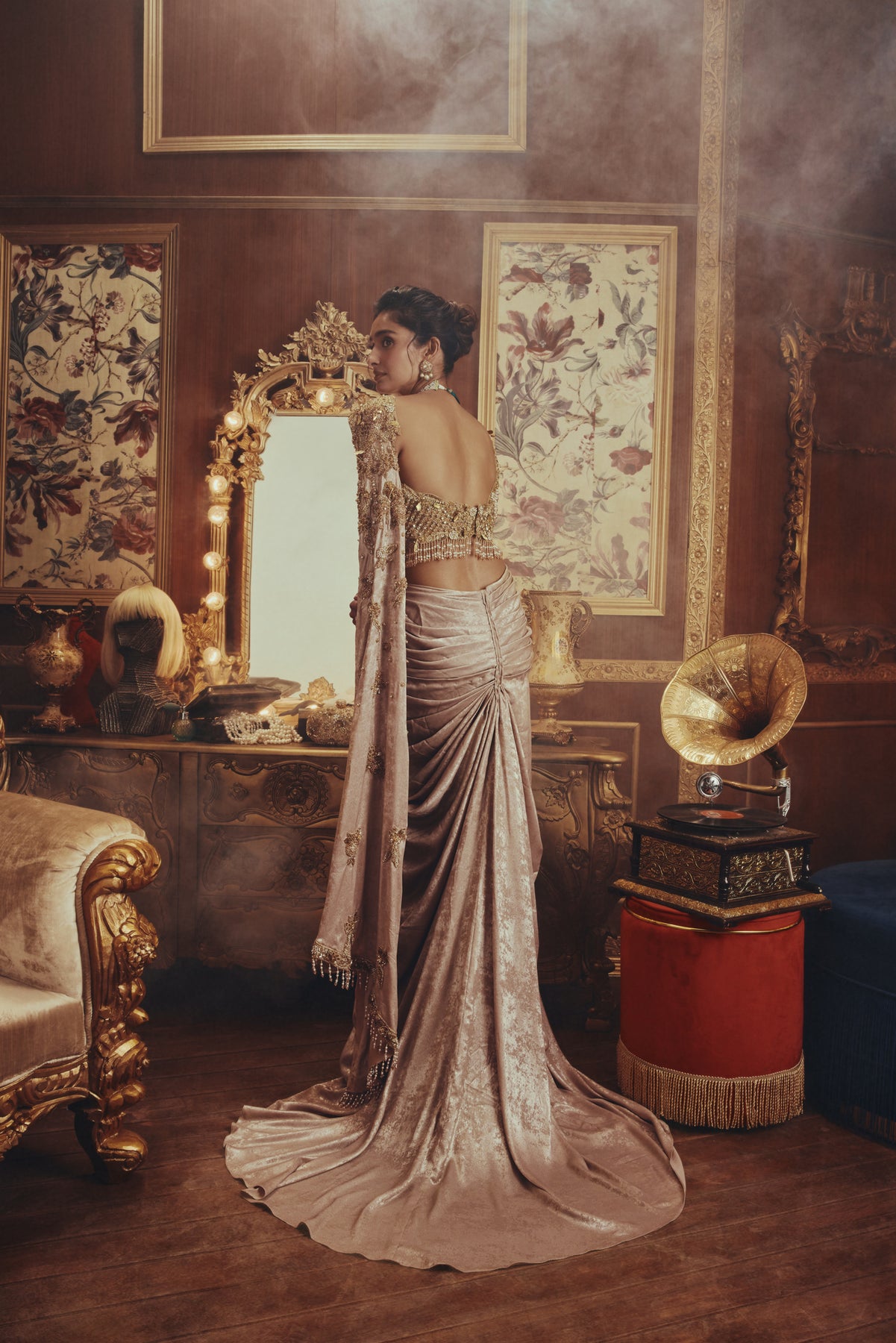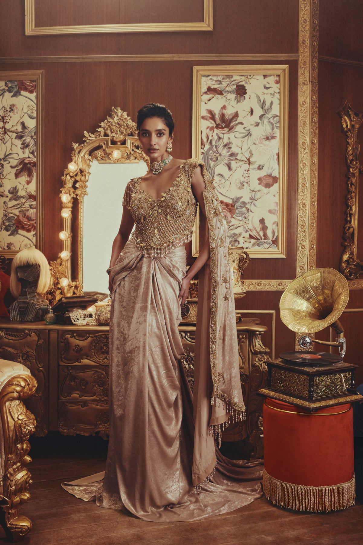 A sculpted gold saree-gown featuring a richly embellished blouse with intricate beadwork, sequins, and antique gold accents. The deep neckline and tasseled shoulder detailing add drama, while the back reveals a low-cut silhouette with delicate pearl fringes. The metallic draped skirt is softly ruched to contour the body and extends into an elegant trail, creating a fluid, statuesque finish.