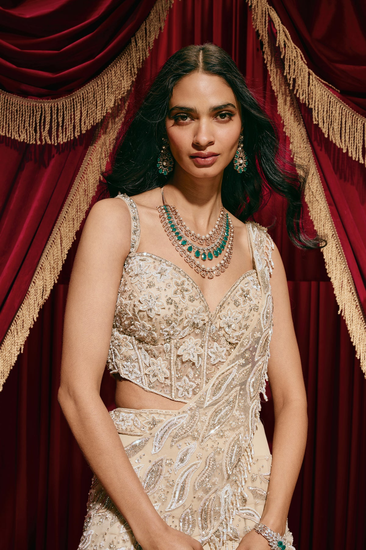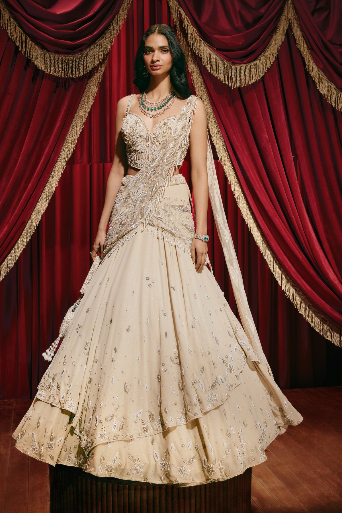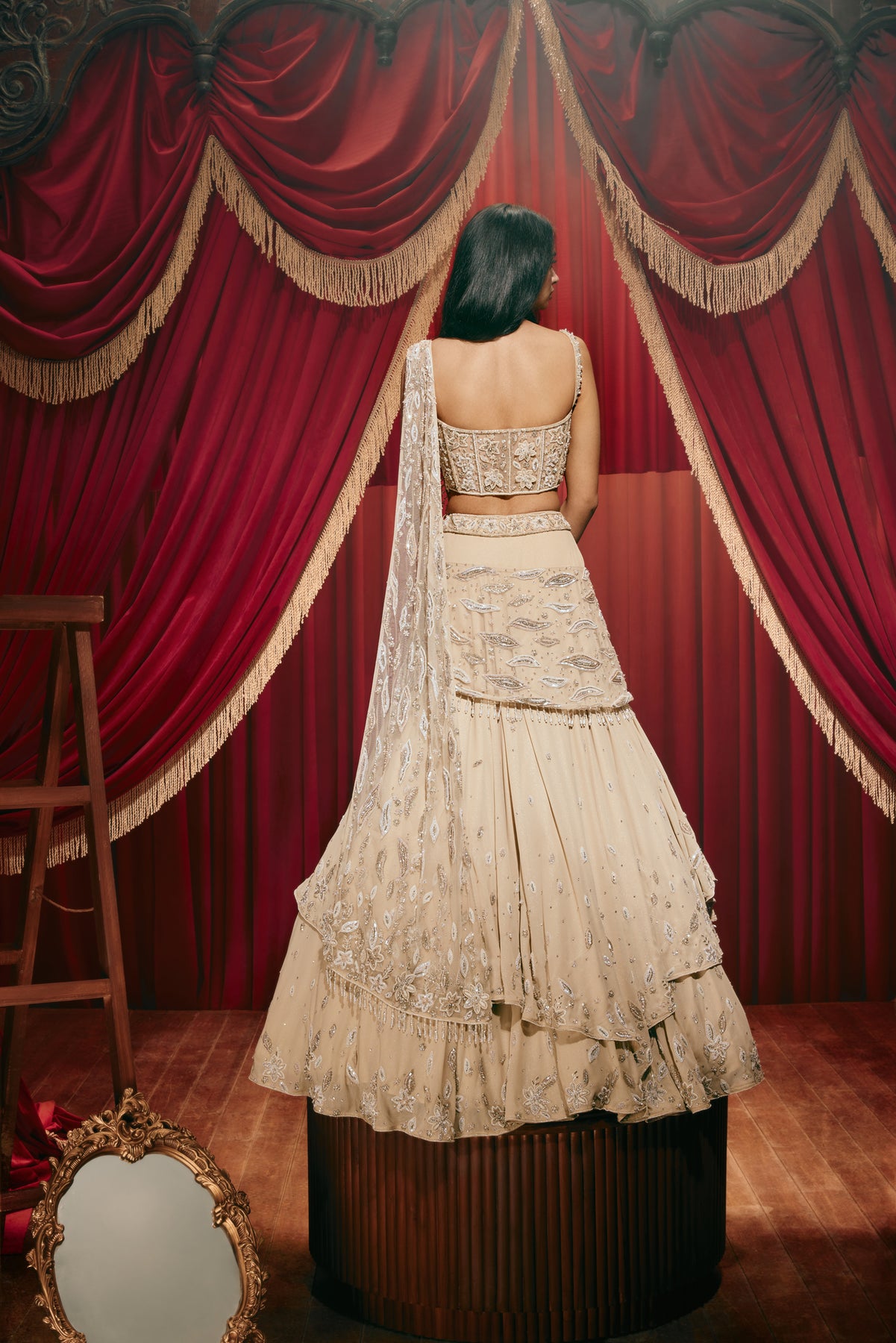 A luminous ivory lehenga ensemble crafted in soft georgette, featuring a sculpted corset blouse intricately hand-embroidered with floral motifs, sequins, and delicate beadwork. The sweetheart neckline and embellished straps add a sensual elegance, while the sheer embroidered dupatta drapes effortlessly across the silhouette. Finished with a softly flared skirt adorned with scattered motifs and a richly detailed hem, this look exudes vintage glamour with modern finesse.