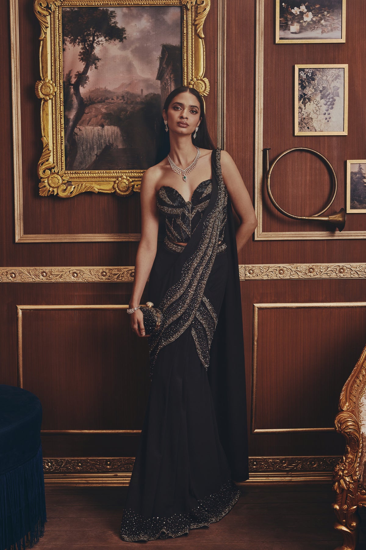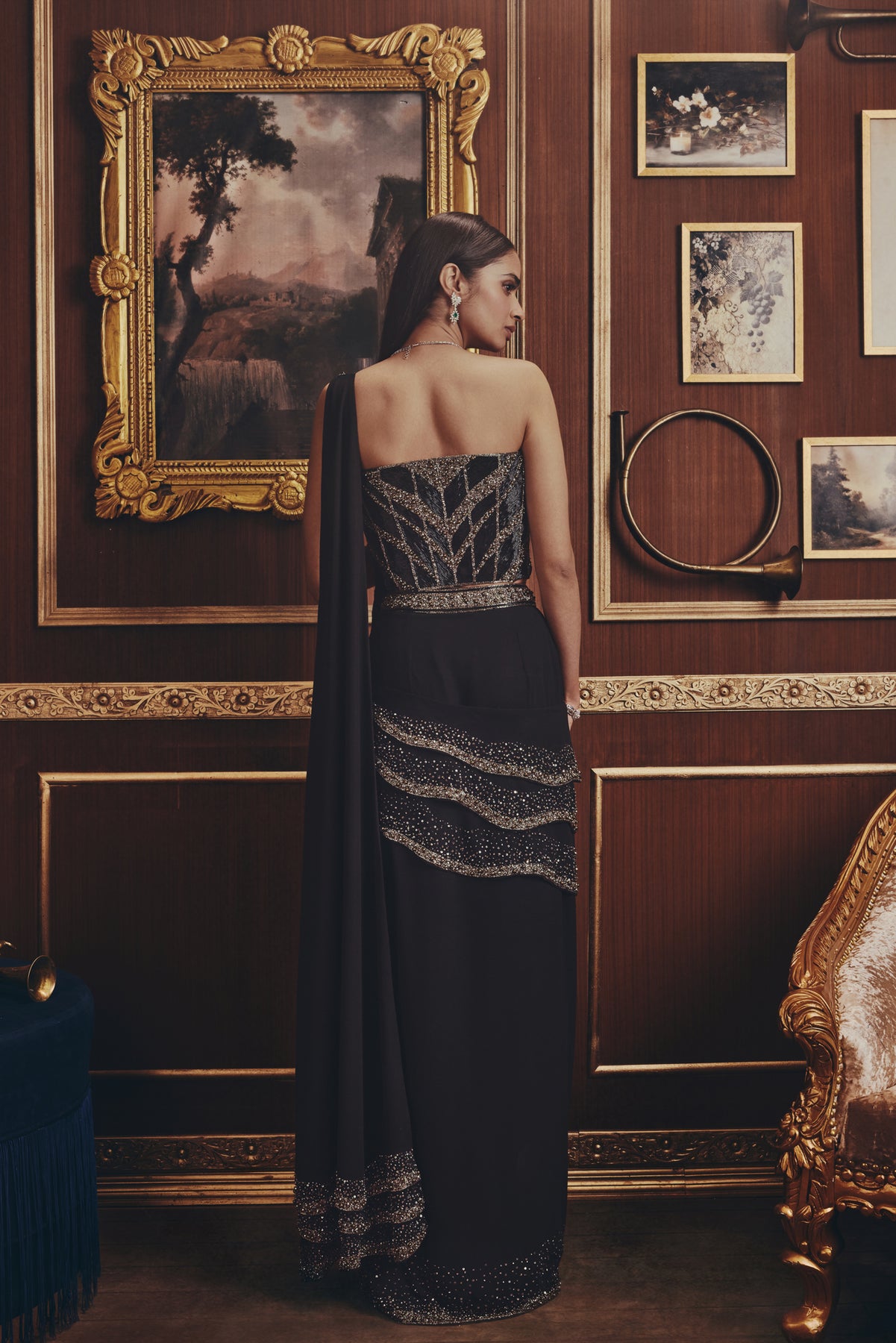 A striking black saree set with gold embellishments delivers sleek, modern glamour. The sculpted blouse features intricate metallic detailing, paired with a fluid drape accented by shimmering borders. Clean lines and rich textures create a bold, elegant silhouette.