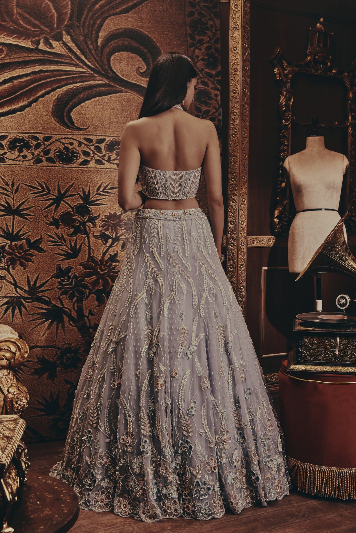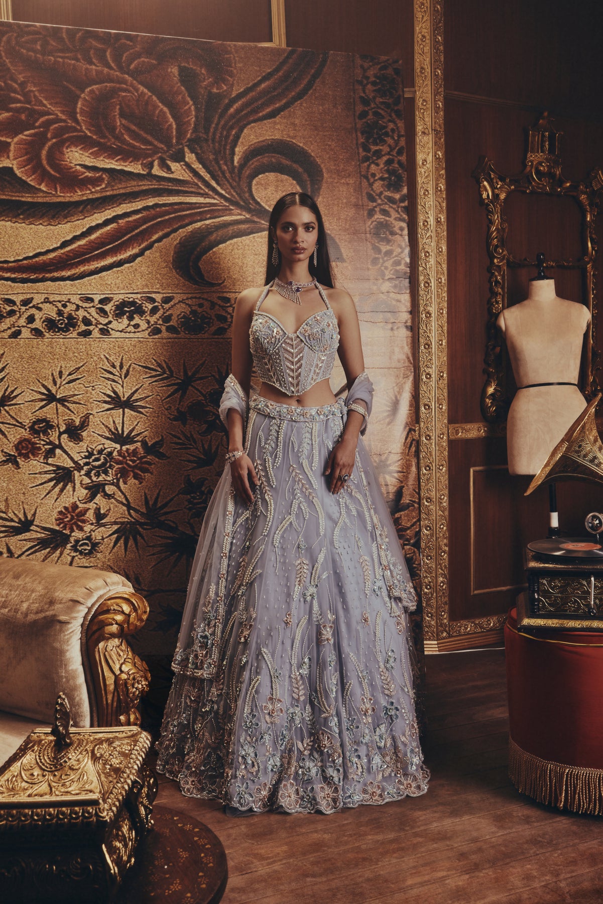 A soft blue lehenga set shimmers with intricate embroidery and delicate beadwork. The structured corset-style blouse features fine detailing and a flattering neckline, paired with a flowing skirt adorned with floral and vine motifs. A sheer dupatta adds lightness and movement to the look.