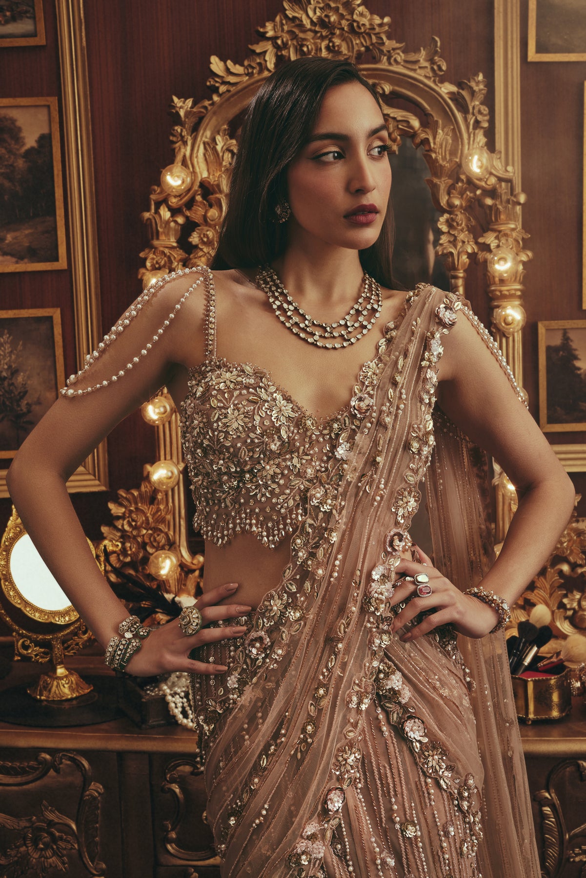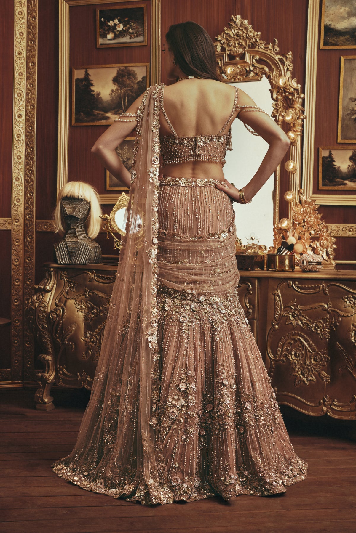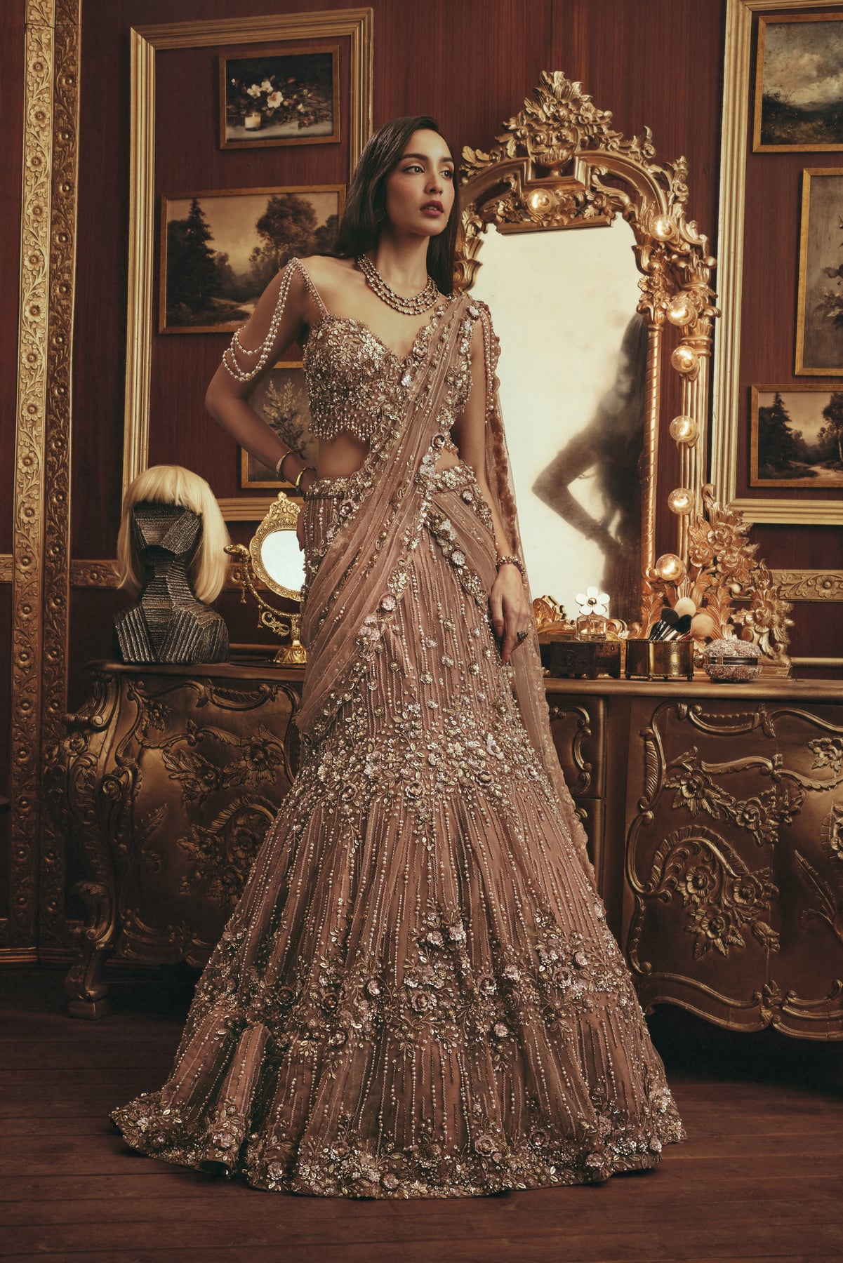 A statement burnt peach lehenga crafted with lavish hand embroidery, shimmering sequins, and dimensional floral detailing. The richly embellished blouse features delicate pearl drapes along the shoulders, adding a touch of vintage glamour. Paired with a voluminous skirt adorned with intricate vertical and floral motifs, the look is completed with a sheer, embroidered dupatta draped elegantly across the body.