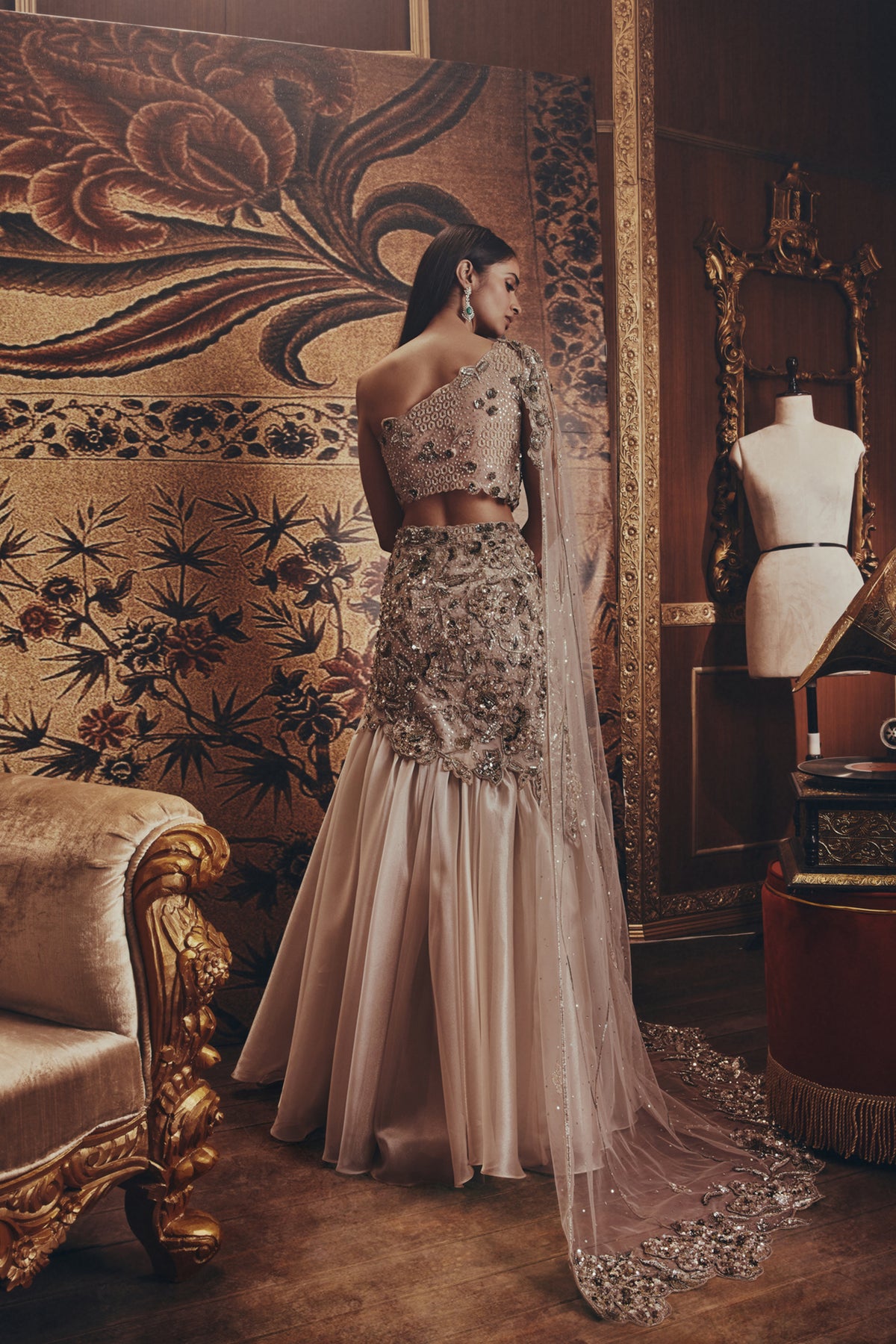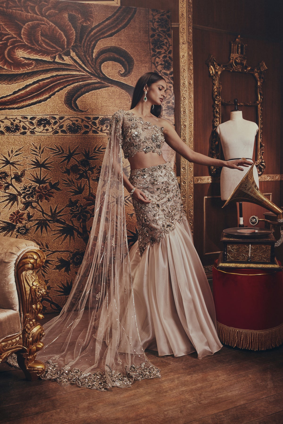 A soft blue lehenga set shimmers with intricate embroidery and delicate beadwork. The structured corset-style blouse features fine detailing and a flattering neckline, paired with a flowing skirt adorned with floral and vine motifs. A sheer dupatta adds lightness and movement to the look.