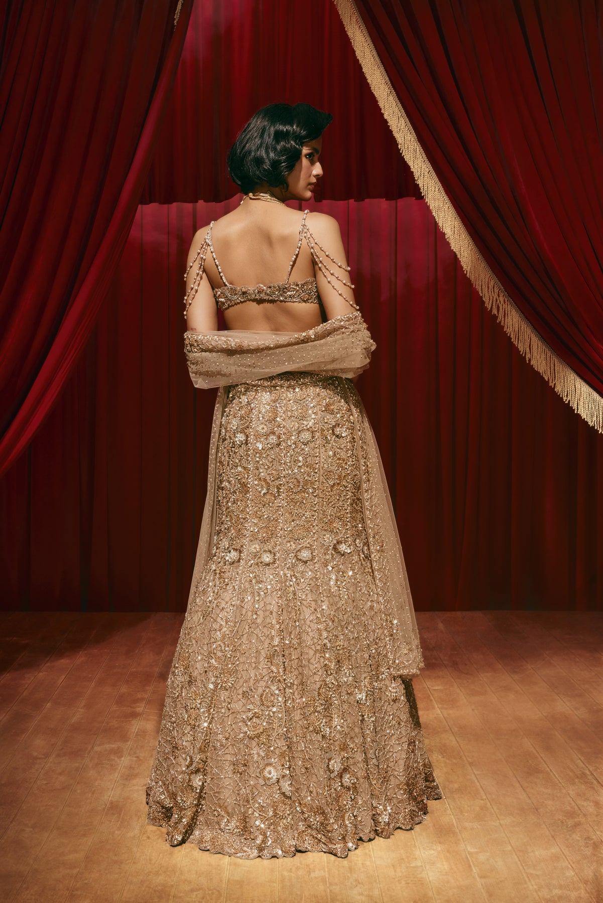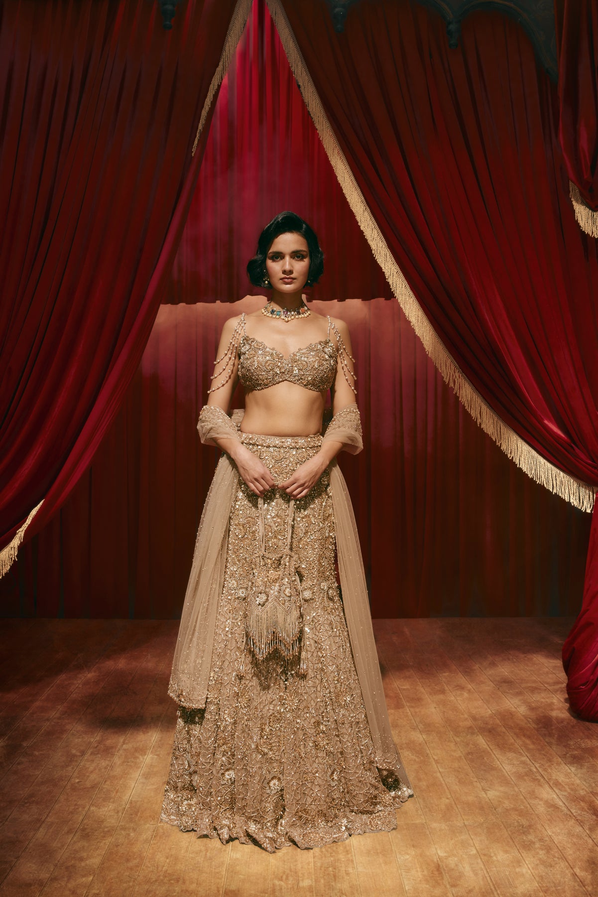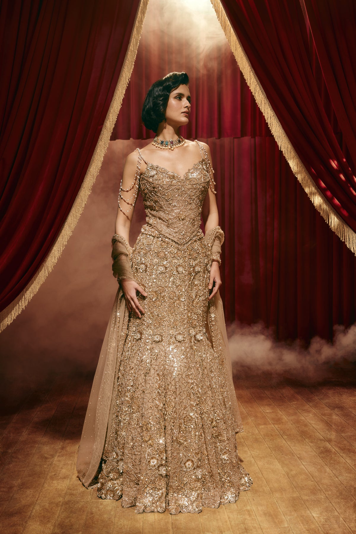 An opulent four-piece lehenga set designed for versatile elegance. Featuring a bustier, a sculpted corset, an intricately embroidered fish-cut skirt, and a sheer dupatta, this ensemble allows multiple styling options. Wear it with the bustier for a statement look or style the skirt without the corset for a classic lehenga silhouette.