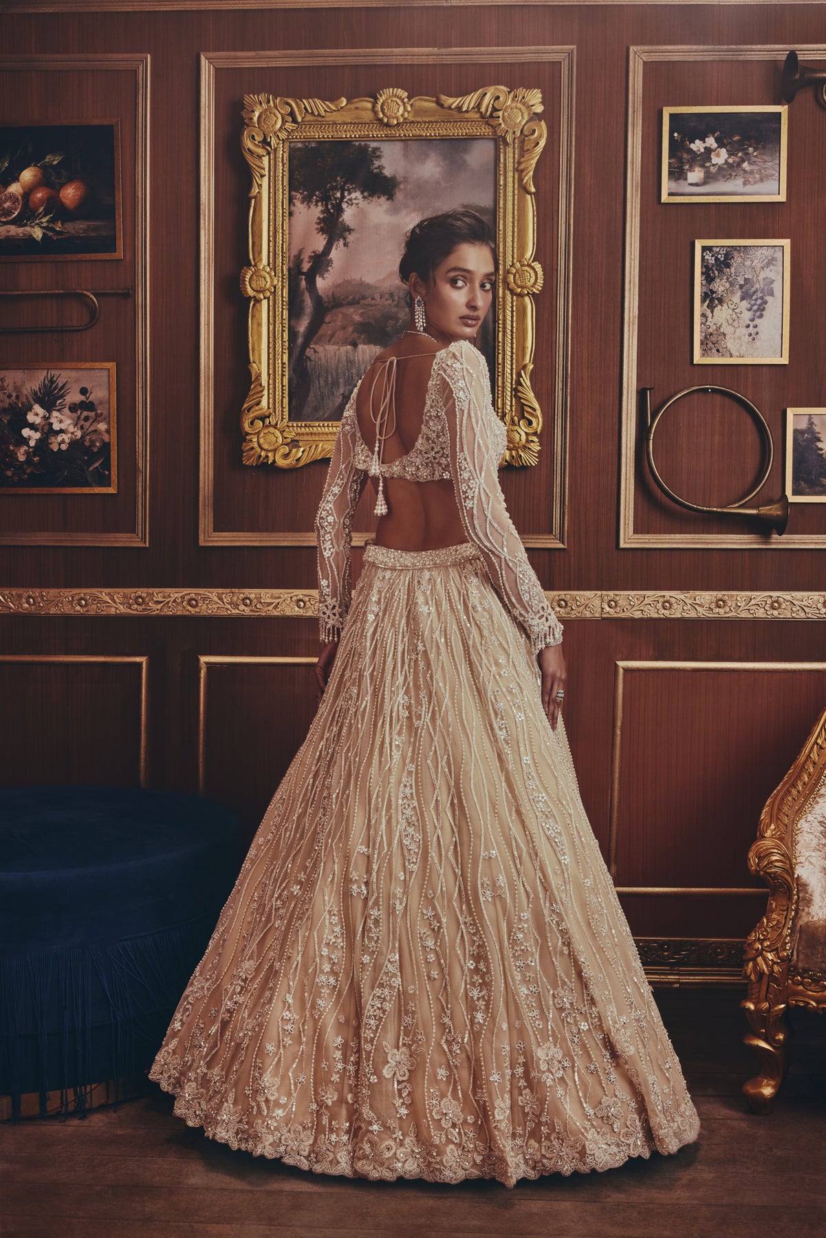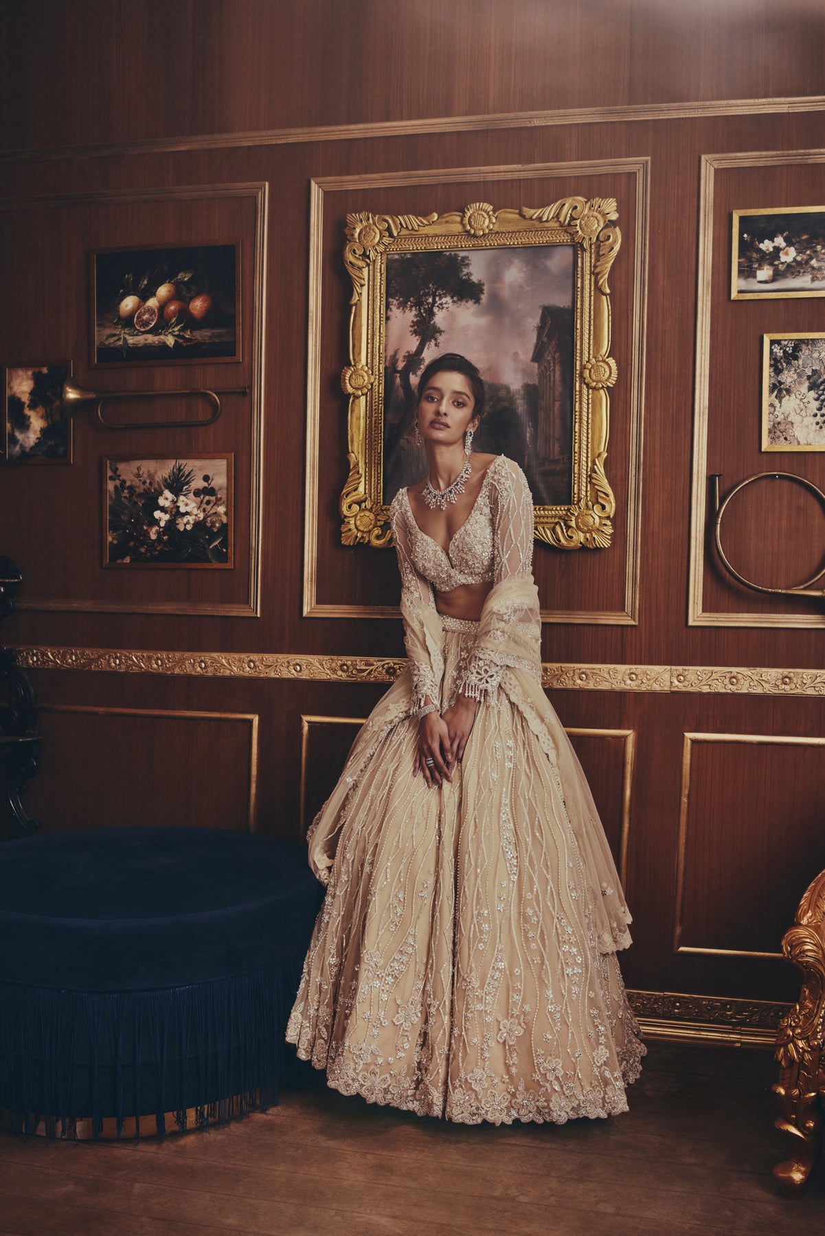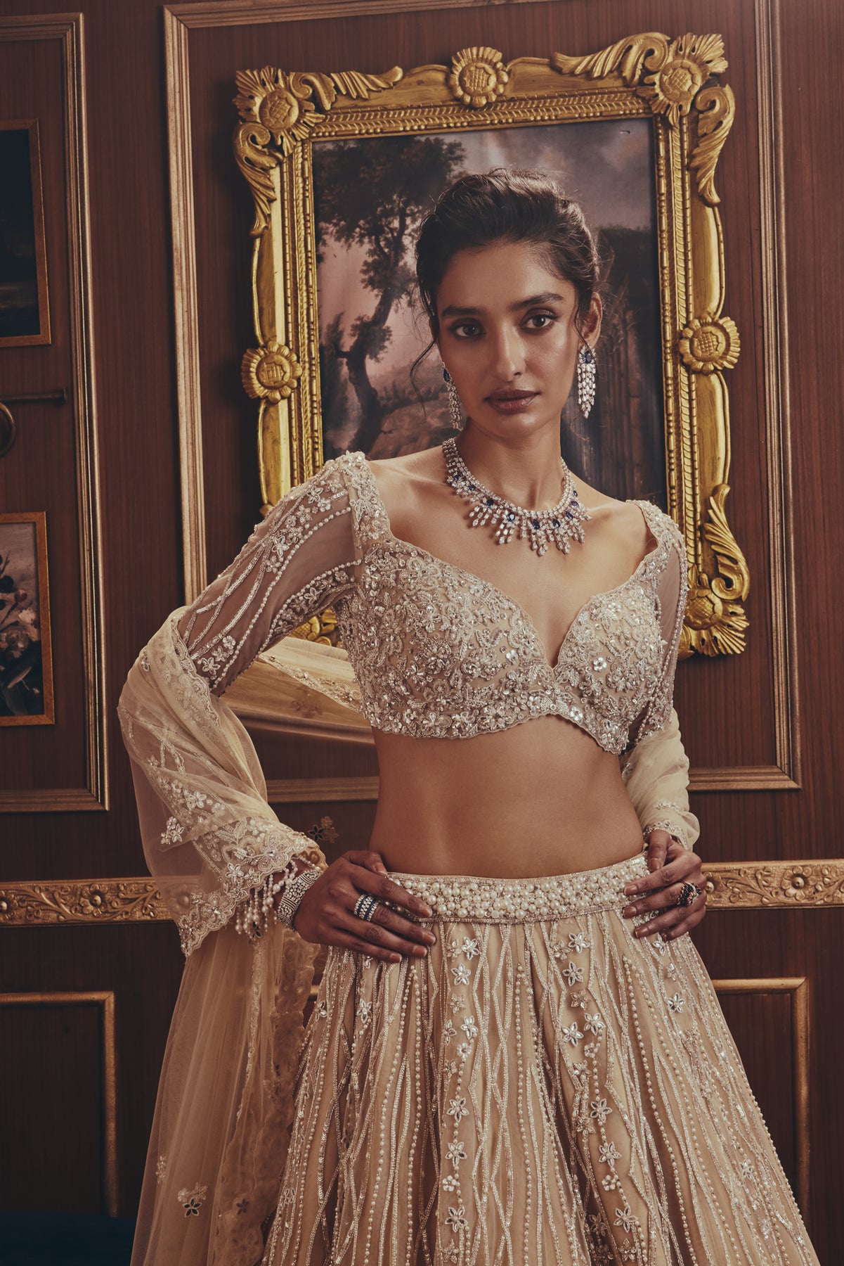 An ivory lehenga set exudes understated luxury with intricate embroidery and soft shimmer. The delicately embellished blouse features sheer sleeves and a sculpted neckline, paired with a voluminous skirt detailed with flowing, vine-like patterns. A lightweight dupatta adds an airy finish.