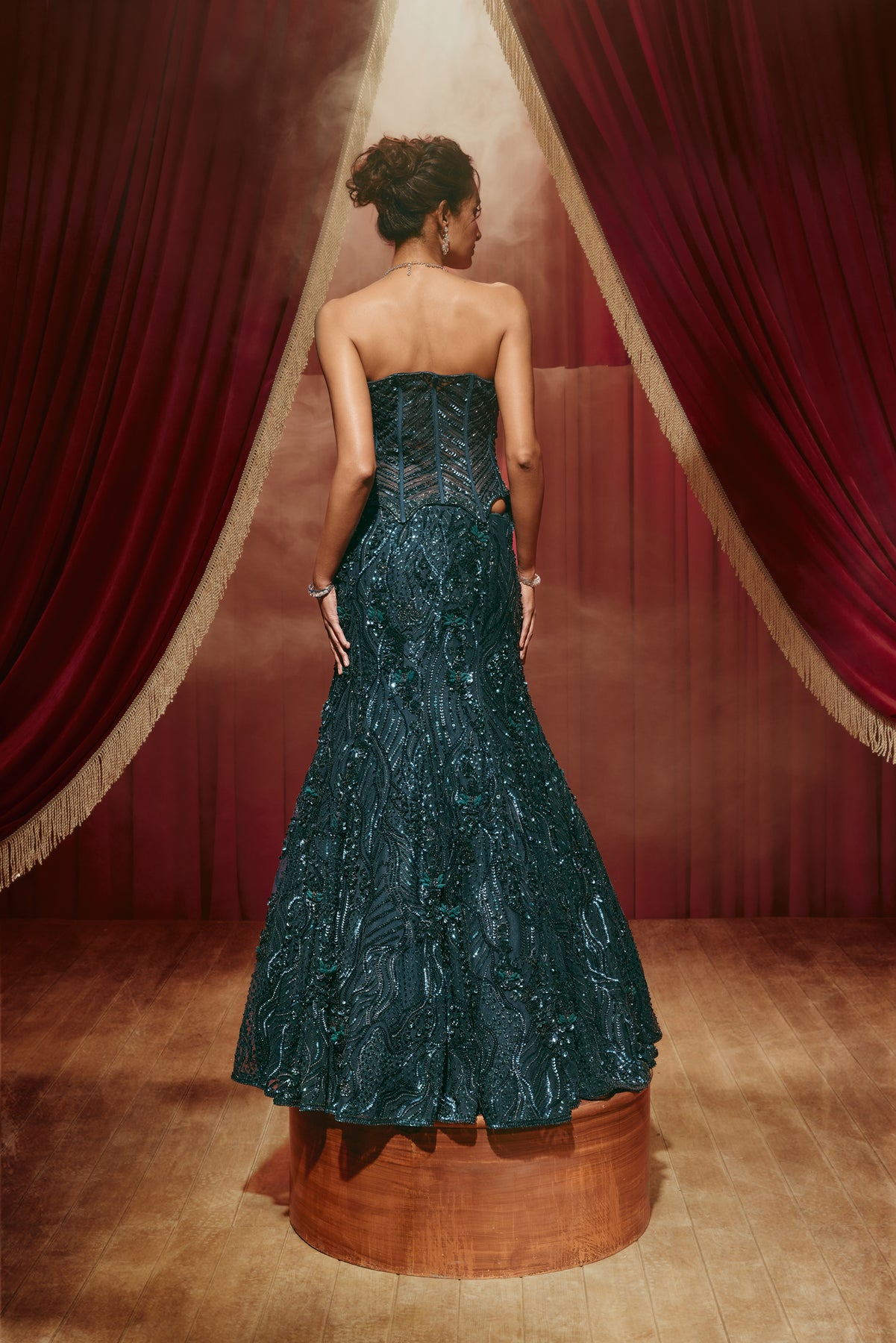A show-stopping midnight-toned gown crafted with exquisite attention to detail. The structured corset bodice is richly embellished with intricate beadwork, sculpting the silhouette with elegance and strength. Flowing into a full, embroidered skirt, the design shimmers subtly with every movement. Delicate sheer capes adorned with cascading embellishments add drama elevating the ensemble with a couture finish.
