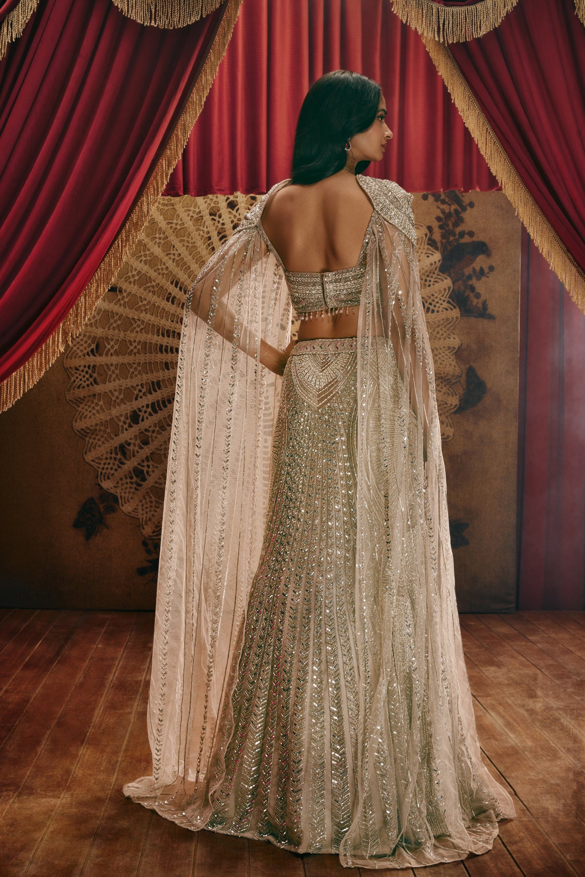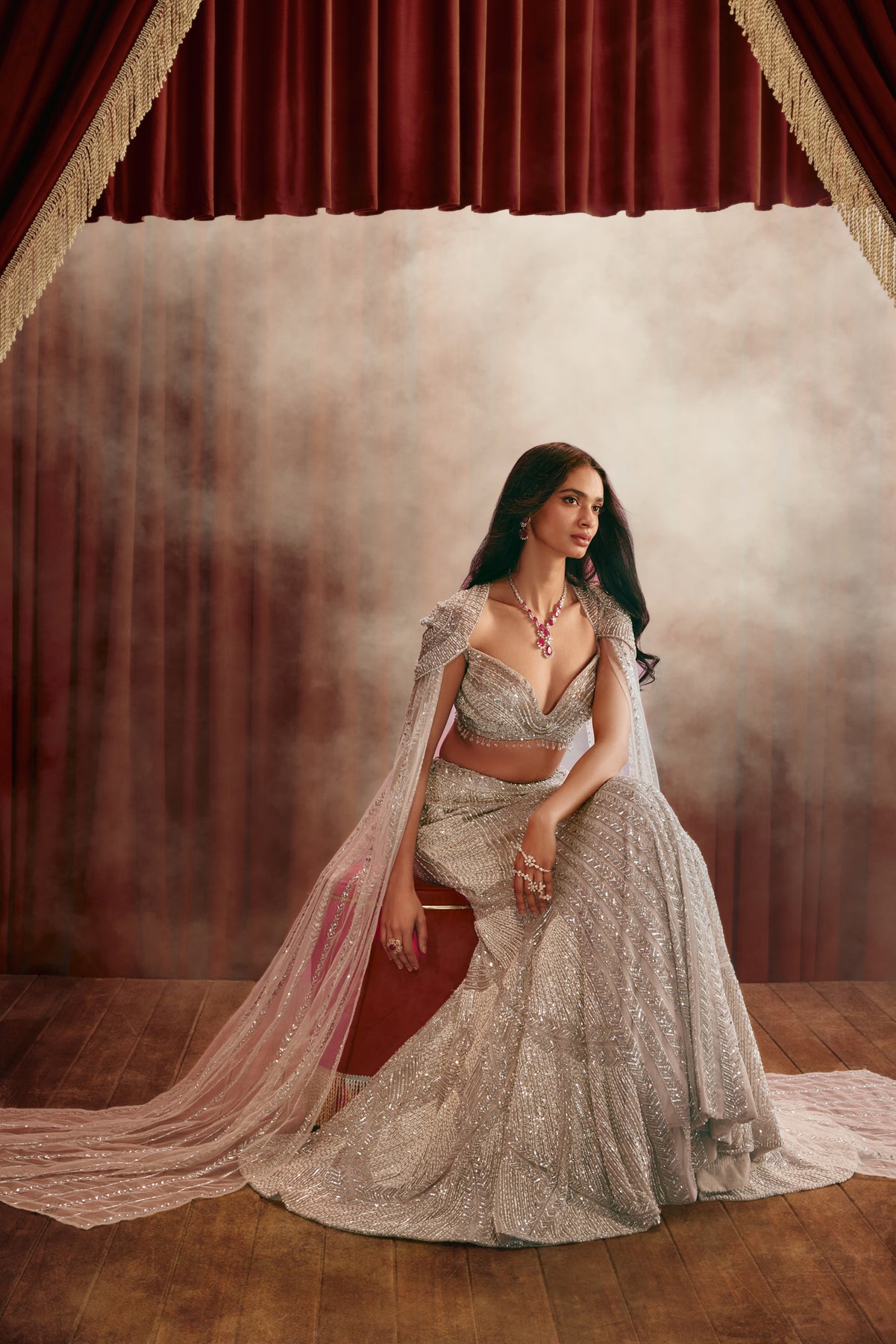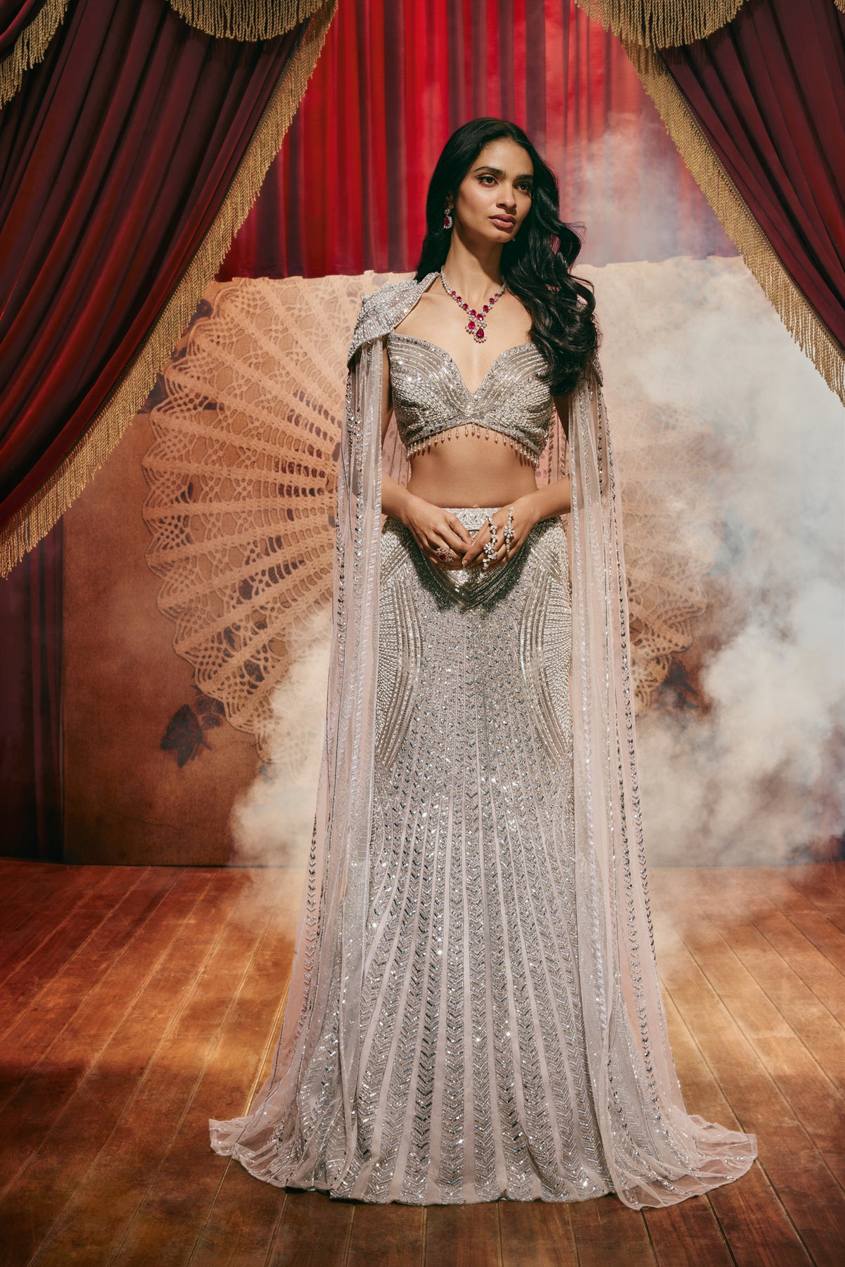 A dazzling lehenga ensemble crafted in luminous silver tones, featuring a sculpted, intricately embellished bustier paired with a finely embroidered flared skirt. Vertical sequin patterns elongate the silhouette, while the sheer cape-style drape adds fluid elegance and drama. Detailed beadwork and shimmer accents elevate the look.