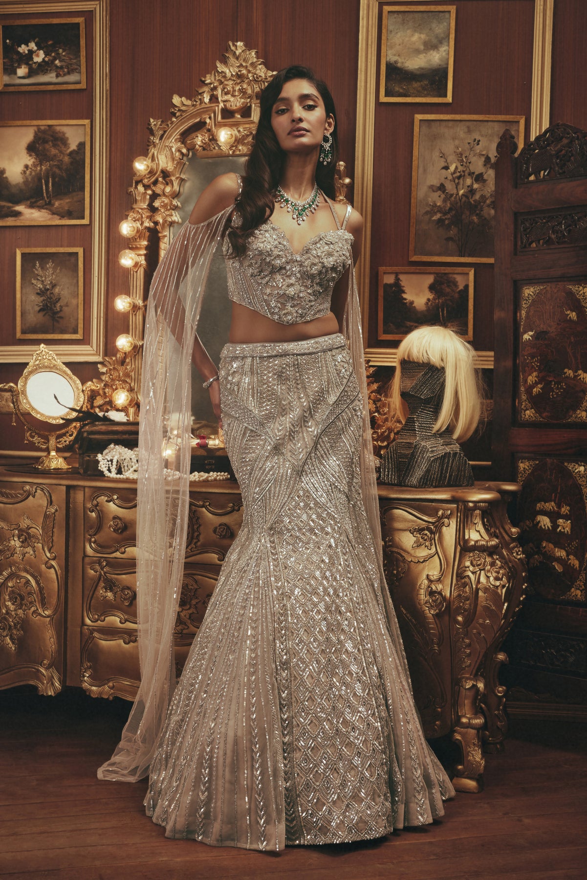 A stunning embellished lehenga set with intricately embroidered corset-style blouse featuring delicate floral detailing and a flattering neckline, paired with a richly textured, high-waist lehenga skirt adorned in geometric and linear beadwork. Soft, sheer drapes fall gracefully from the shoulders, adding movement and drama. Finished in a luminous champagne-silver tone, this ensemble blends timeless craftsmanship with contemporary glamour