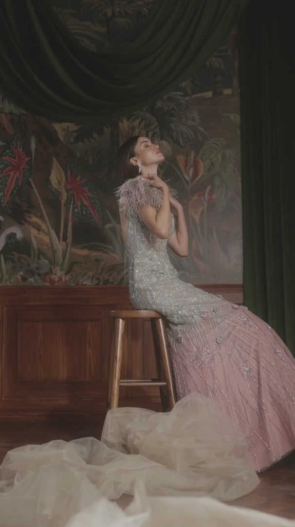 Step into a world of ethereal elegance with this enchanting lilac and pink ombre mermaid gown based on net. The gradient hue seamlessly transitions from soft lilac to delicate blush pink, evoking a sense of romantic allure. Adding a touch of celestial whimsy, the gown features feathered shoulder accents. Completed with 3D hand embroidered flowers meticulously crafted to add dimension and opulence to the ensemble. Each design is a masterpiece of dazzling brilliance, adorned with lustrous metallics, intricate embellishments, and reflective textures.